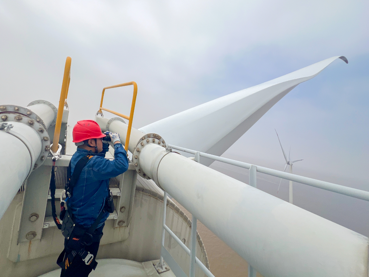 找彩吧海上风电维护人员对风机叶片进行定期检查。 张露 提供