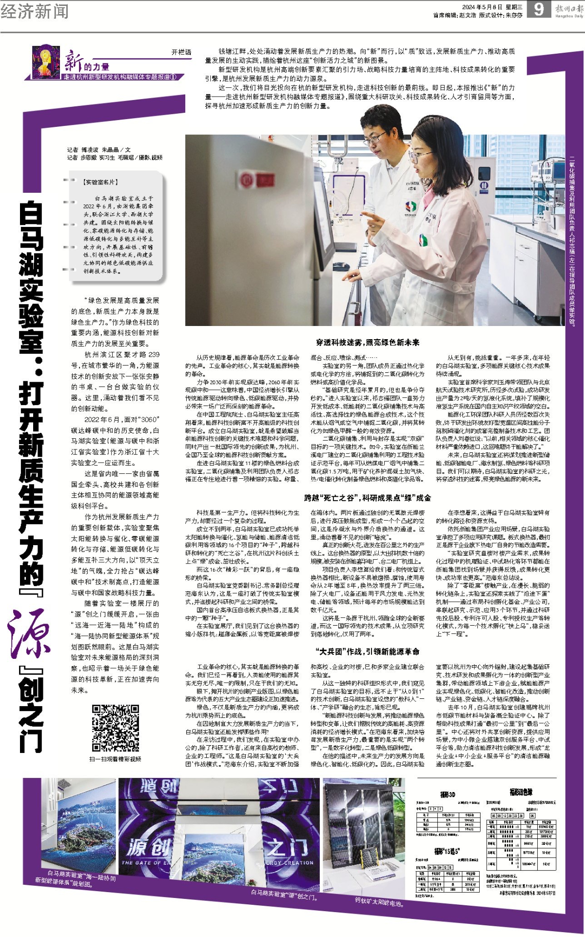 向“新”而行,以“质”致远。5月8日,《杭州日报》推出《“新”的力量——走进杭州新型研发机构融媒体专题报道》,探寻杭州加速形成新质生产力的创新力量,开栏首期整版报道《白马湖实验室:打开新质生产力的“源”创之门》。