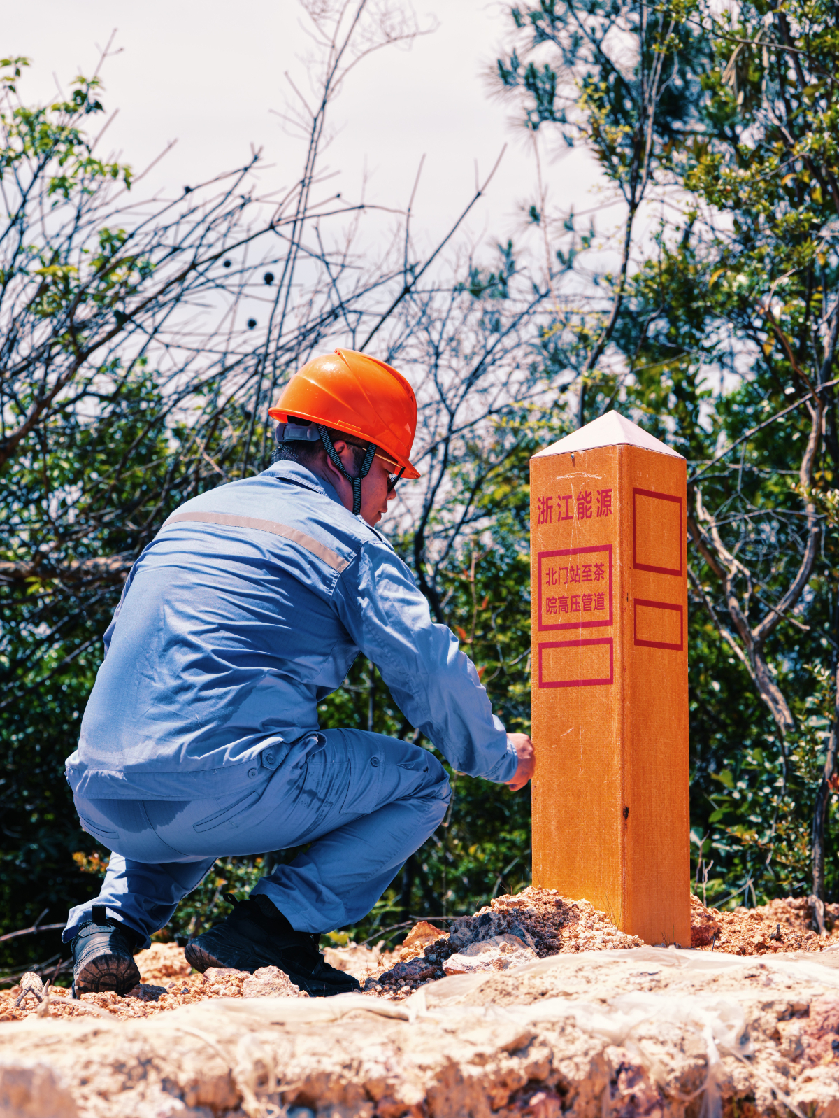 找彩吧燃气宁海公司巡线人员检查北门站至茶园高压管线标志桩。 宁海公司 提供