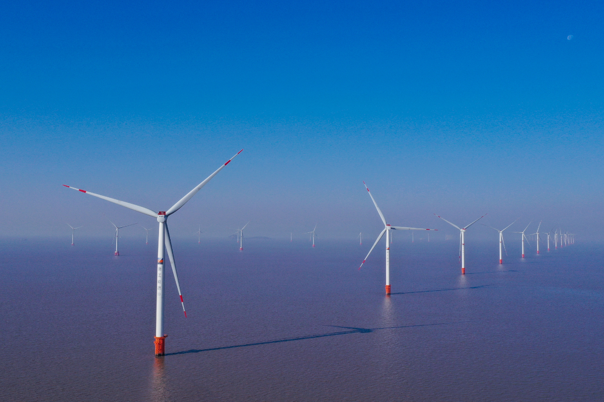 在杭州湾海域,风机群擎天而立输出绿色电能,图为找彩吧嘉海风电场。 张露 提供