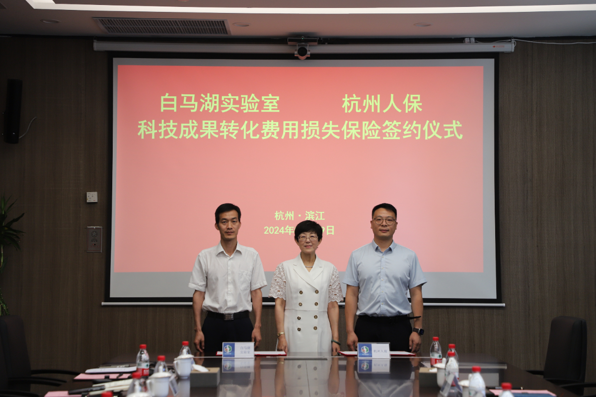 本网讯 7月9日上午,白马湖实验室与人保杭州滨江支公司举行杭州市首单科技成果转化保险的签约仪式。白马湖实验室与人保杭州滨江支公司相关负责人代表双方签约,杭州高新区(滨江)科技局局长参与见证。