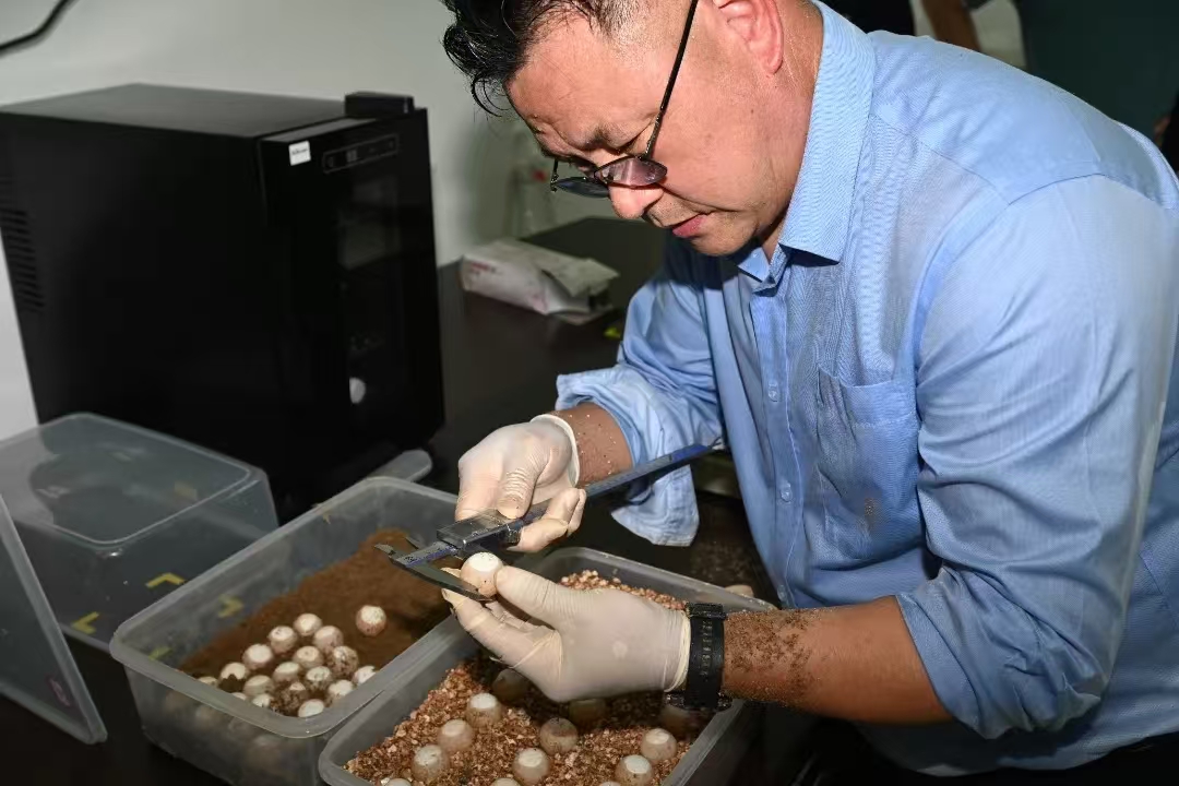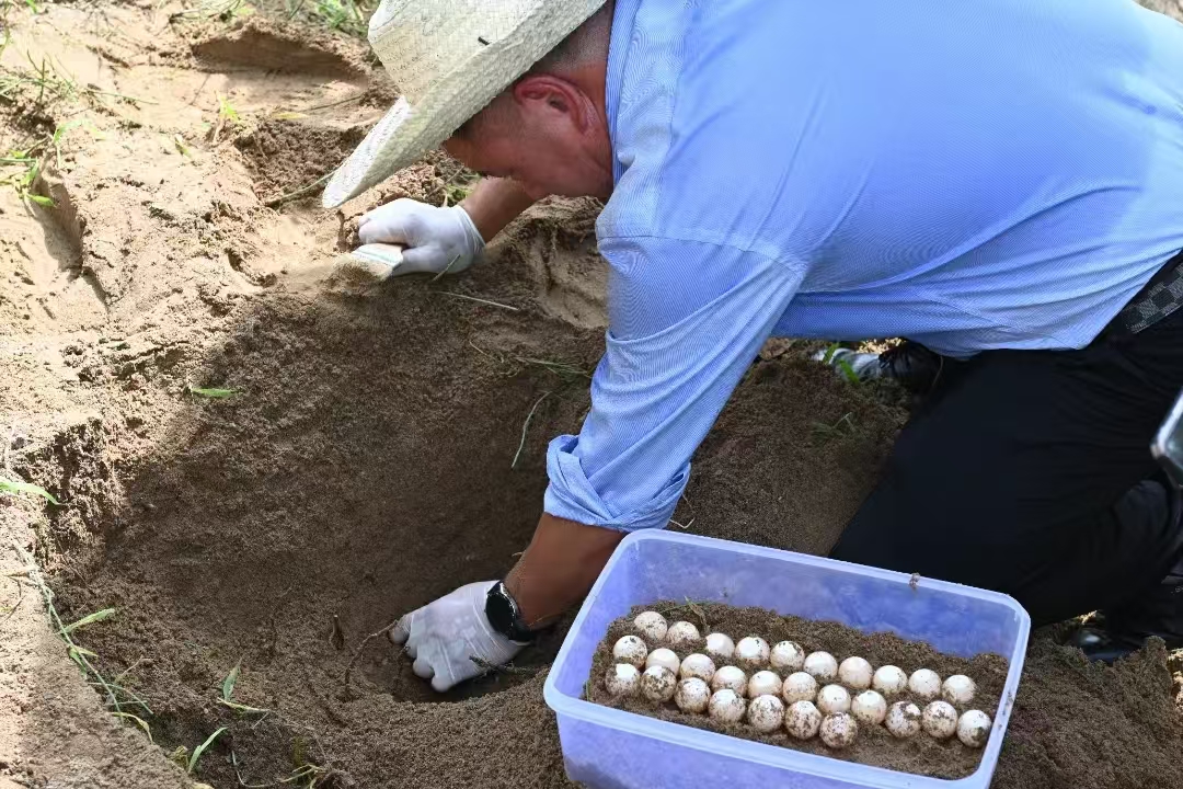 随着表面黄褐色的沙土被拨开,在大约深30公分的位置,一枚枚雪白的鼋卵也现出真容,叶承义用刷子轻轻扫开鼋卵旁边的泥土,小心翼翼将它们拿进塑料盒,带回站内的控温车间内进行测量、登记,以便孵化。