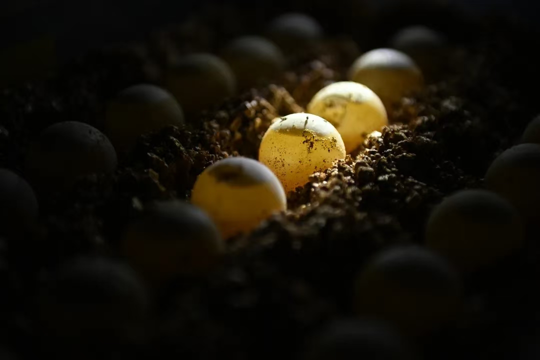 “鼋卵的外壳比较薄,如果能看到大面积的白色,说明这枚卵是受精成功的。”挑出受精的鼋卵后,叶承义将它们整齐地放置在铺满厚厚一层蛭石的塑料盒中,再盖上薄薄一层蛭石,盖好盖子,做好标记,放进恒温恒湿培养箱。“蛭石的作用主要是保温和保湿,大约58天到63天就能孵化出鼋苗。”