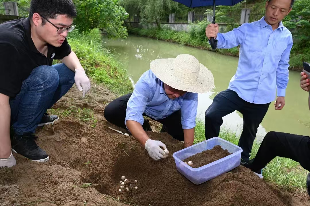 在滩坑水电站水生生物增殖放流站亲鼋培育池旁的土坡上,增殖放流站站长叶承义正在珠江水产研究所所长朱新平的远程指导下,对鼋卵进行操作。“我们不能乱挖一气,湿润的沙土中往往埋藏着鼋卵,挖的时候动作必须要轻柔。”叶承义用手将产卵周边的沙土一点点拨开。