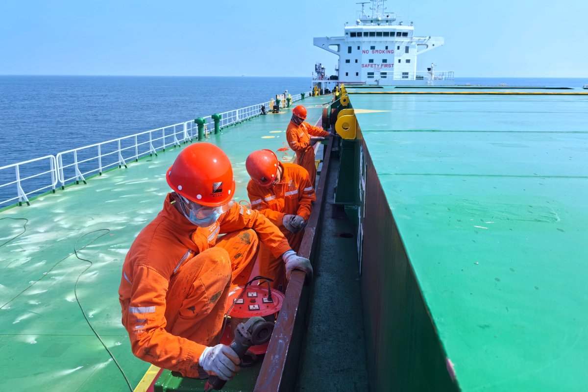 长袖长裤和大头皮鞋的“反季”穿搭,一身汗水、满脸灰尘,这是船员们的夏日写真,橙、白、蓝的坚守身影,在海上勾勒出一道靓丽的风景线。