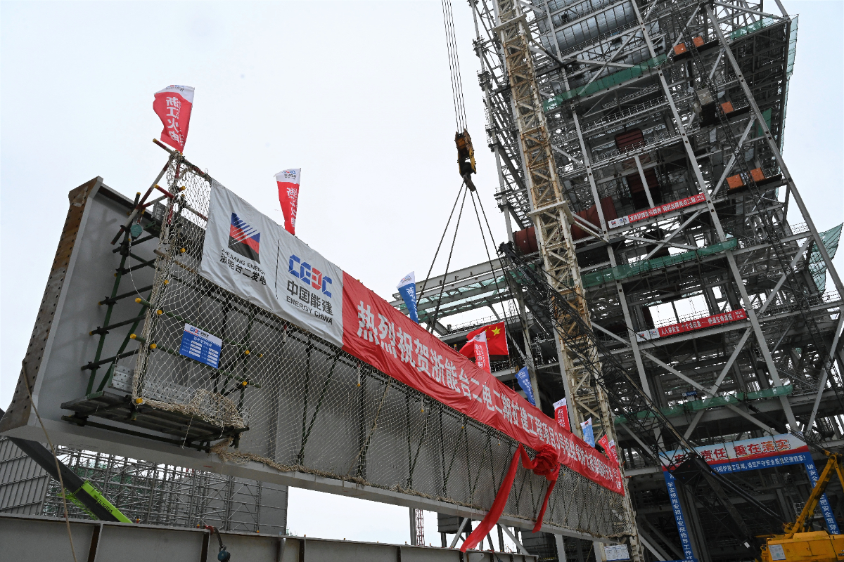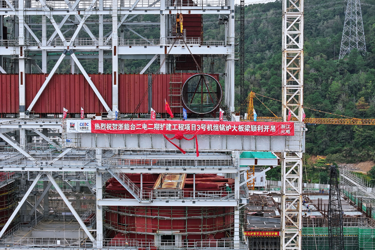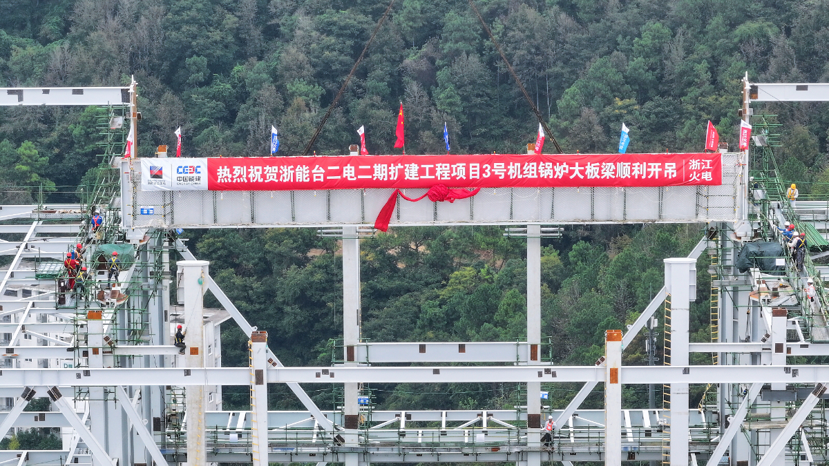 台二电二期3号锅炉首根大板梁吊装就位。 俞琬 提供
