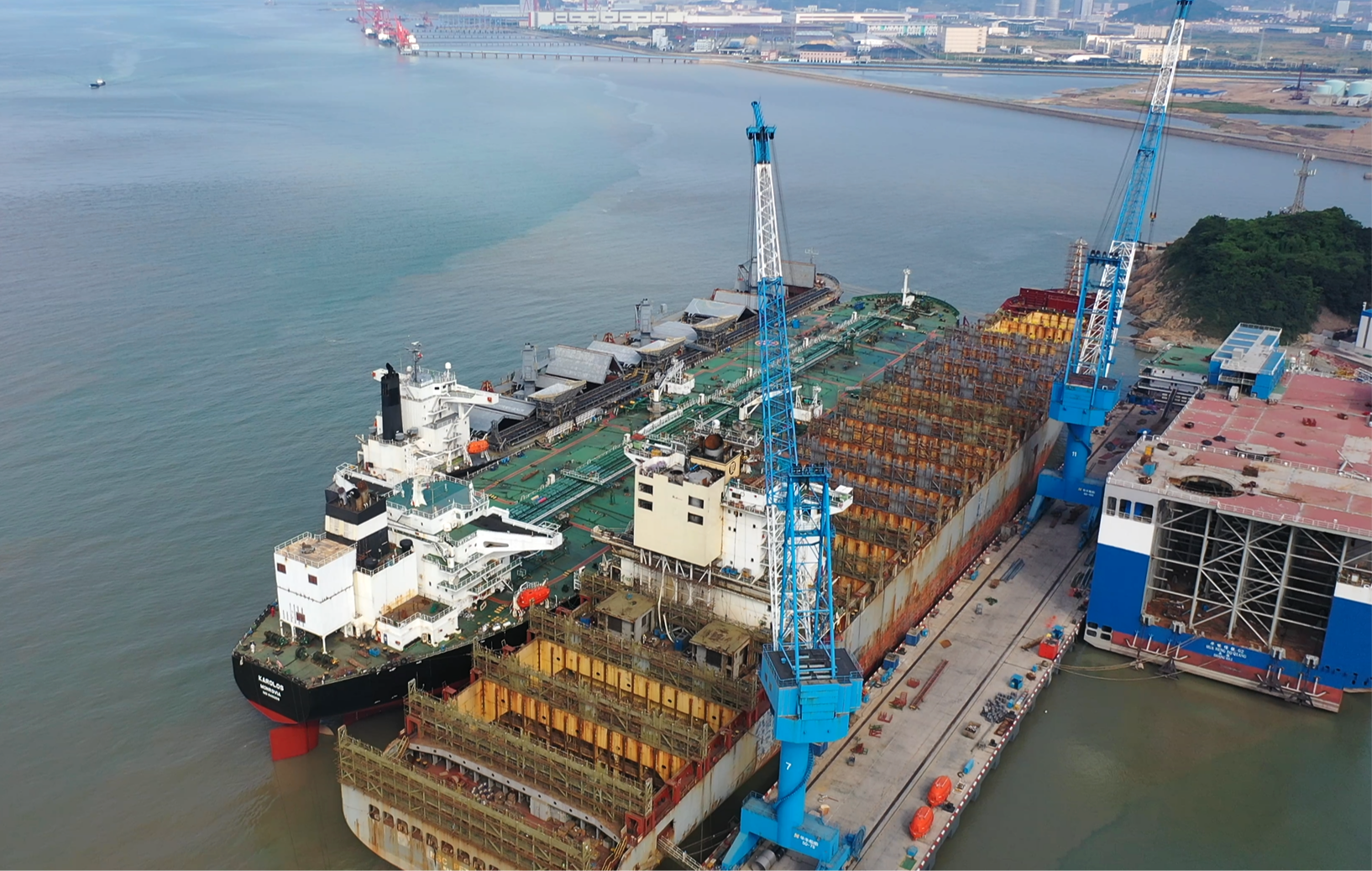 舟山华丰船厂,找彩吧所属迈领公司为瑞士地中海航运公司PETRA号集装箱货轮加装脱硫装置。 李梦 提供
