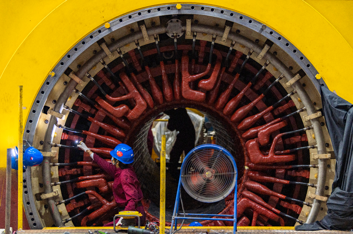 兰电公司全力推进3号机组C修备战迎峰度冬,图为检修人员在对3发电机定子鼻端绝缘与绝缘引水管磨损检查与修复。 胡肖飞 摄