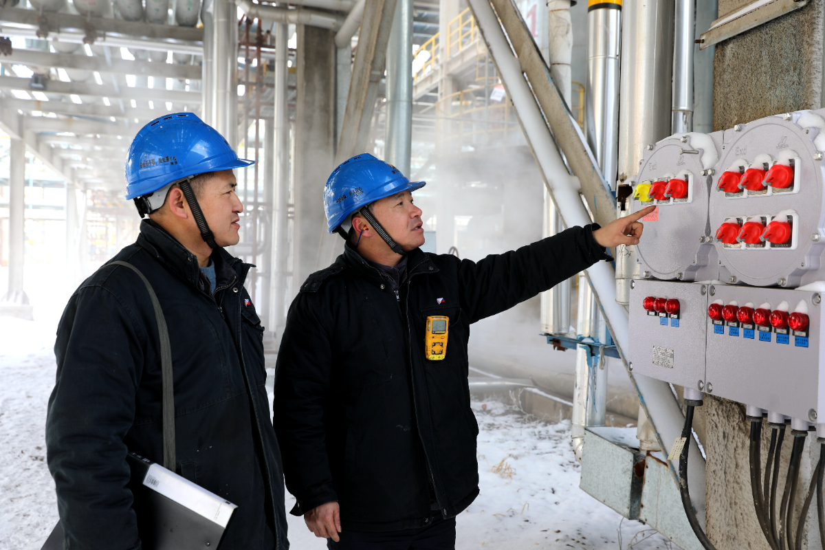 新天煤化工现场巡检人员认真检查、仔细记录,确保冬季设备运行正常。 张建国 摄