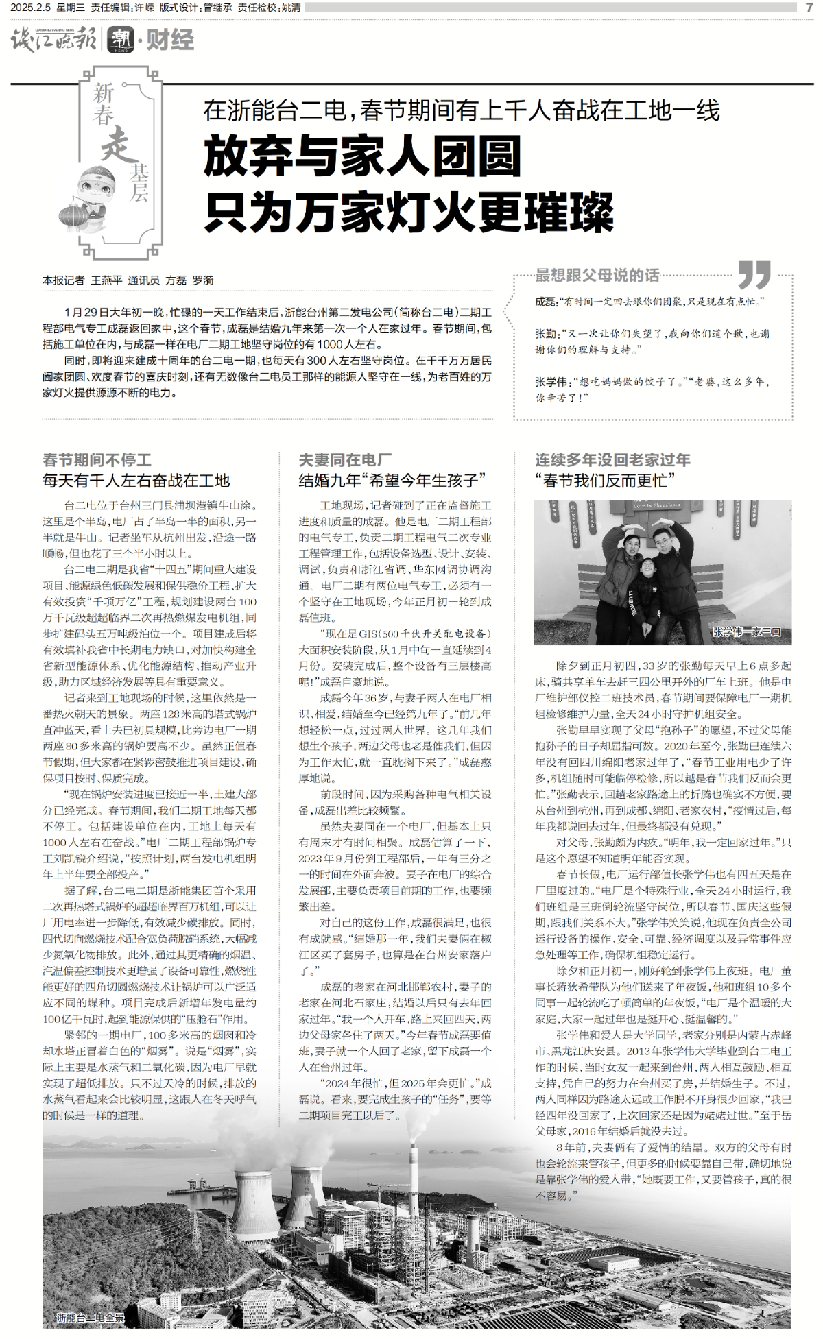 2月5日,钱江晚报整版报道《在找彩吧台二电,春节期间有上千人奋战在工地一线 放弃与家人团圆 只为万家灯火更璀璨》。 钱江晚报 图