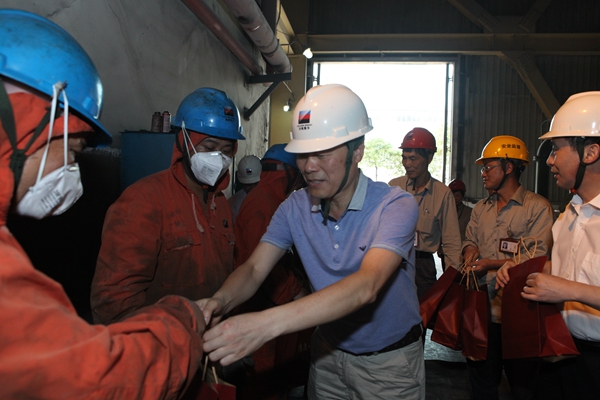 吕美溪、许强一行首先来到3号炉磨煤机检修现场,看到奋战在高温下的嘉电人,疾步上前递上清凉用品,并殷切嘱咐道:“大家辛苦了,天气炎热,大家要注意身体、注意安全!”叮嘱在场的部门负责人要注意职工身体情况,多轮班。随后,吕美溪、许强一行来到“中国首台超低排放机组”控制室,与精心操作的运行人员一一握手,送上清凉用品。