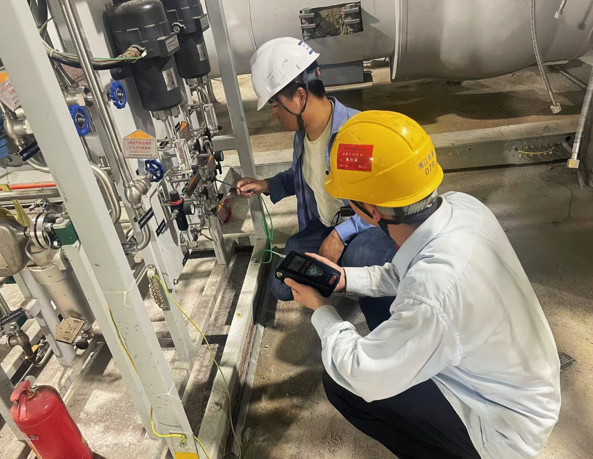 发电机氢气系统查漏小队成员拿着氢气检漏仪仔细排查各可疑漏点设备。 龚嘉沫 提供