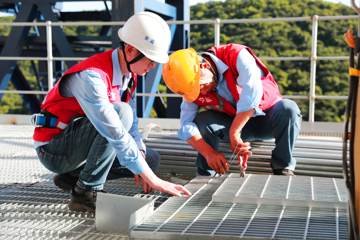 浙江电建安全员检查锅炉平台钢格栅加固情况。 张晓艳 摄