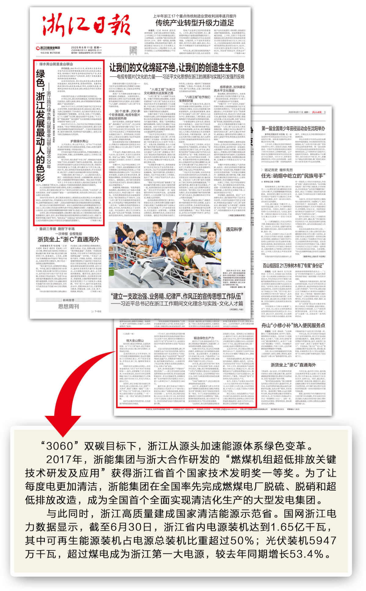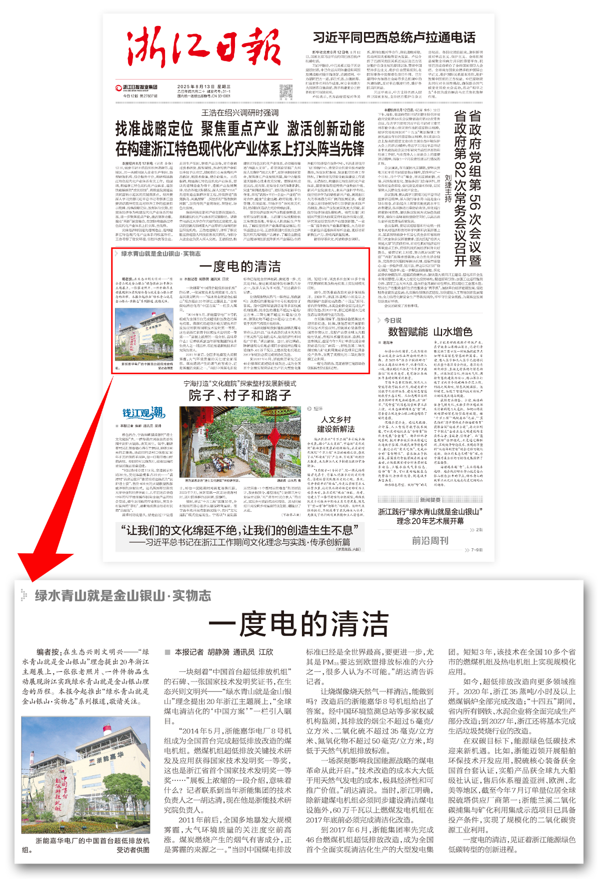 8月13日起,《浙江日报》推出“绿水青山就是金山银山·实物志”系列报道,开栏首篇在头版刊发《一度电的清洁》,见证多年来浙江找彩吧绿色低碳转型的创新进程。
