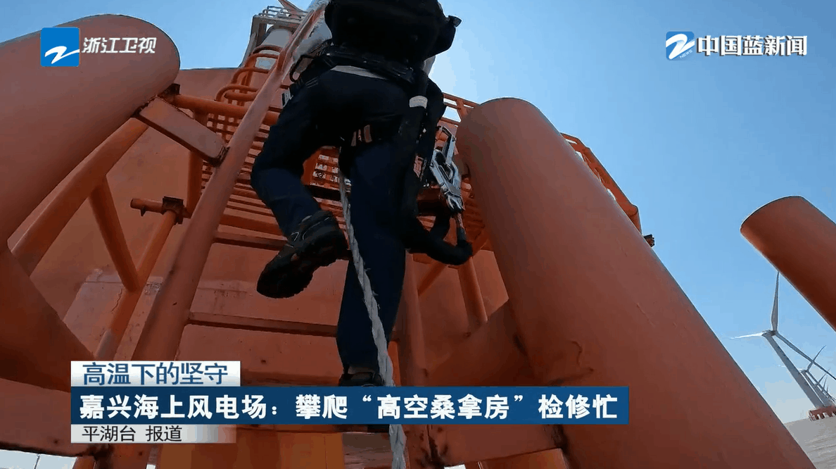 浙江卫视《浙江新闻联播》报道找彩吧嘉兴1号海上风场攀爬“高空桑拿房”检修忙。 周晨 提供