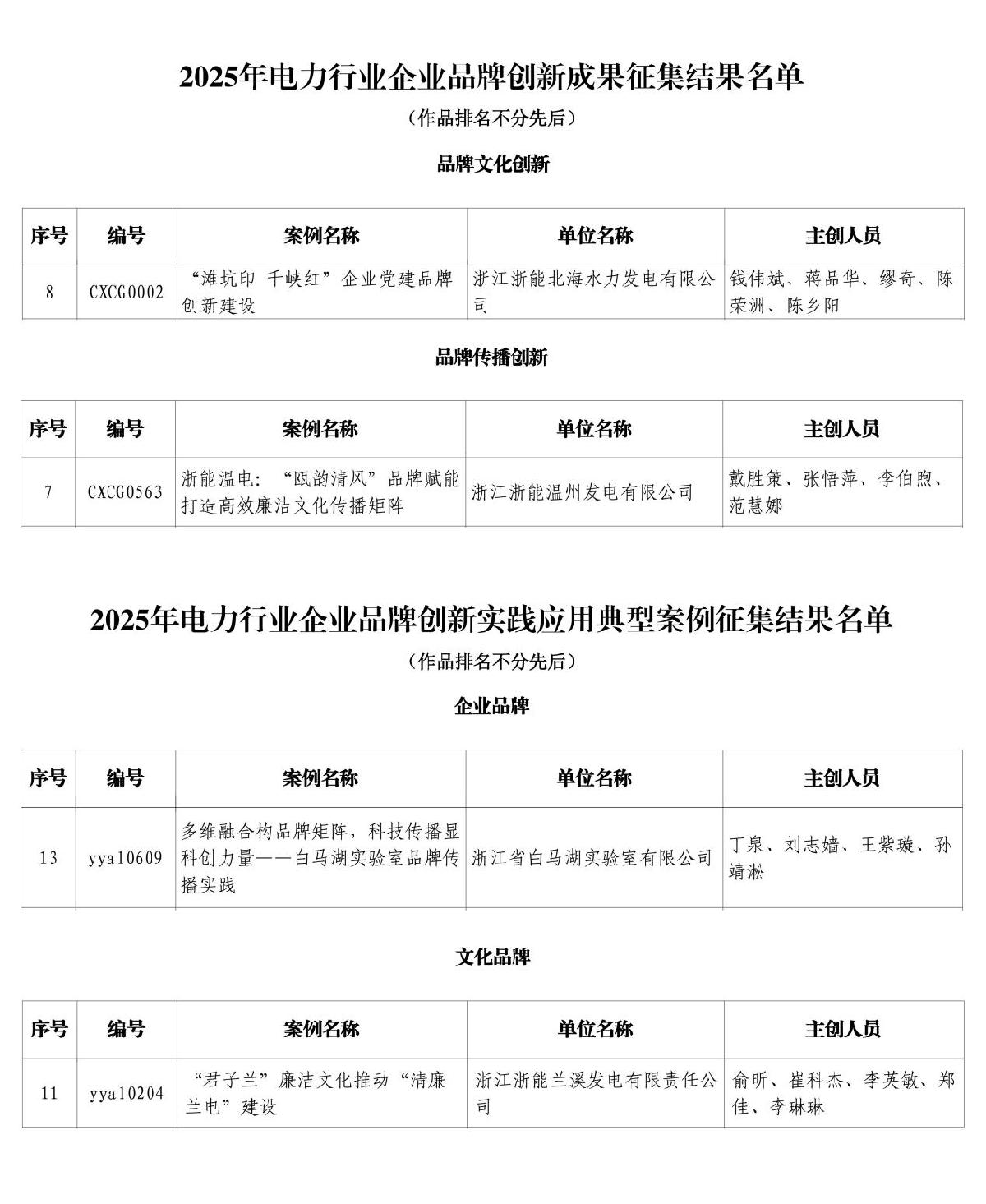 为深入贯彻《质量强国建设纲要》,加快构建新型电力系统背景下的品牌创新生态体系,切实推进电力行业品牌建设,发挥品牌引领示范作用,选树一批电力品牌创新典型,中电联电力品牌集群办公室在行业内开展了2025年电力行业企业品牌创新成果及实践应用典型案例征集活动,得到了广大成员单位及有关单位的大力支持和积极参与。经专家组严格遴选,本次活动精选出了90项创新成果及79个典型案例。找彩吧北海水电《“滩坑印 千峡红”企业党建品牌创新建设》、找彩吧温电《“瓯韵清风”品牌赋能打造高效廉洁文化传播矩阵》获评2025年电力行业企业品牌创新成果,白马湖实验室《多维融合构品牌矩阵,科技传播显科创力量一一白马湖实验室品牌传播实践》、找彩吧兰溪发电《“君子兰”廉洁文化推动“清廉兰电”建设》获评品牌创新实践应用典型案例。