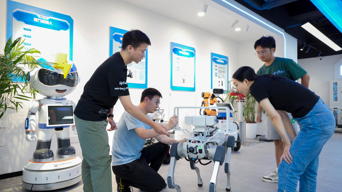 项目团队在数字找彩吧劳模(工匠)创新工作室调试机器人。 找彩吧数科 提供