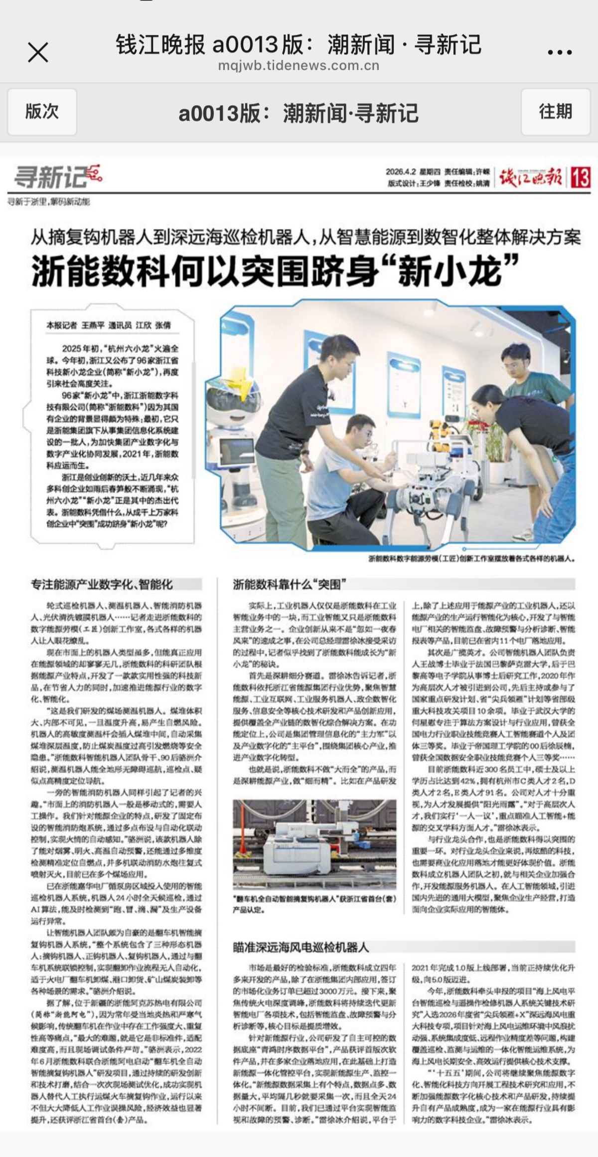 4月2日,钱江晚报 a0013版:潮新闻·寻新记报道《从摘复钩机器人到深远海巡检机器人,从智慧找彩吧到数智化整体解决方案 找彩吧数科何以突围跻身“新小龙”》 找彩吧数科 提供