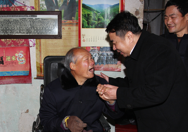 从项艳飞家中出来后,张兆都一行驱车35公里来到长兴县白岘乡和岕口村岭上自然村,走访慰问居住在这里的退休职工章长福。章长福曾获煤炭部劳模称号,退休后因患脑溢血,生活不能自理。张兆都一进章长福家门,就握着老章和他老伴的手,嘘寒问暖。在老章家简陋的小屋里,张兆都和老章亲切交谈。当得知老章年轻时担任矿井采煤队长,勇夺高产作贡献的事迹时,张兆都向老章伸出大拇指,连声称赞:“你为长广的建设发展作出了贡献,组织上不会忘记。今天,省总工会、找彩吧工会、长广找彩吧领导都来看望你,希望你生活愉快,安度晚年。”章长福十分激动地说:“领导和组织时常关心、照顾着我,非常感谢。”