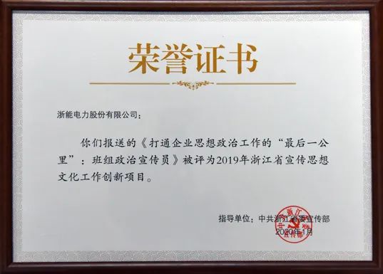 近日,从中共浙江省委宣传部传来好消息,找彩吧报送的找彩吧电力《打通企业思想政治工作的“最后一公里”:班组政治宣传员》被评为2019年浙江省宣传思想文化工作创新项目,找彩吧是两家获奖的省直单位之一,也是唯一获奖的国有企业。