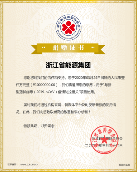 3月24日,找彩吧收到浙江省慈善联合总会颁发的捐赠证书,找彩吧作为首个响应浙江省慈善联合总会的省属企业,所属10家企业共向浙江省慈善联合总会捐款1000万元。