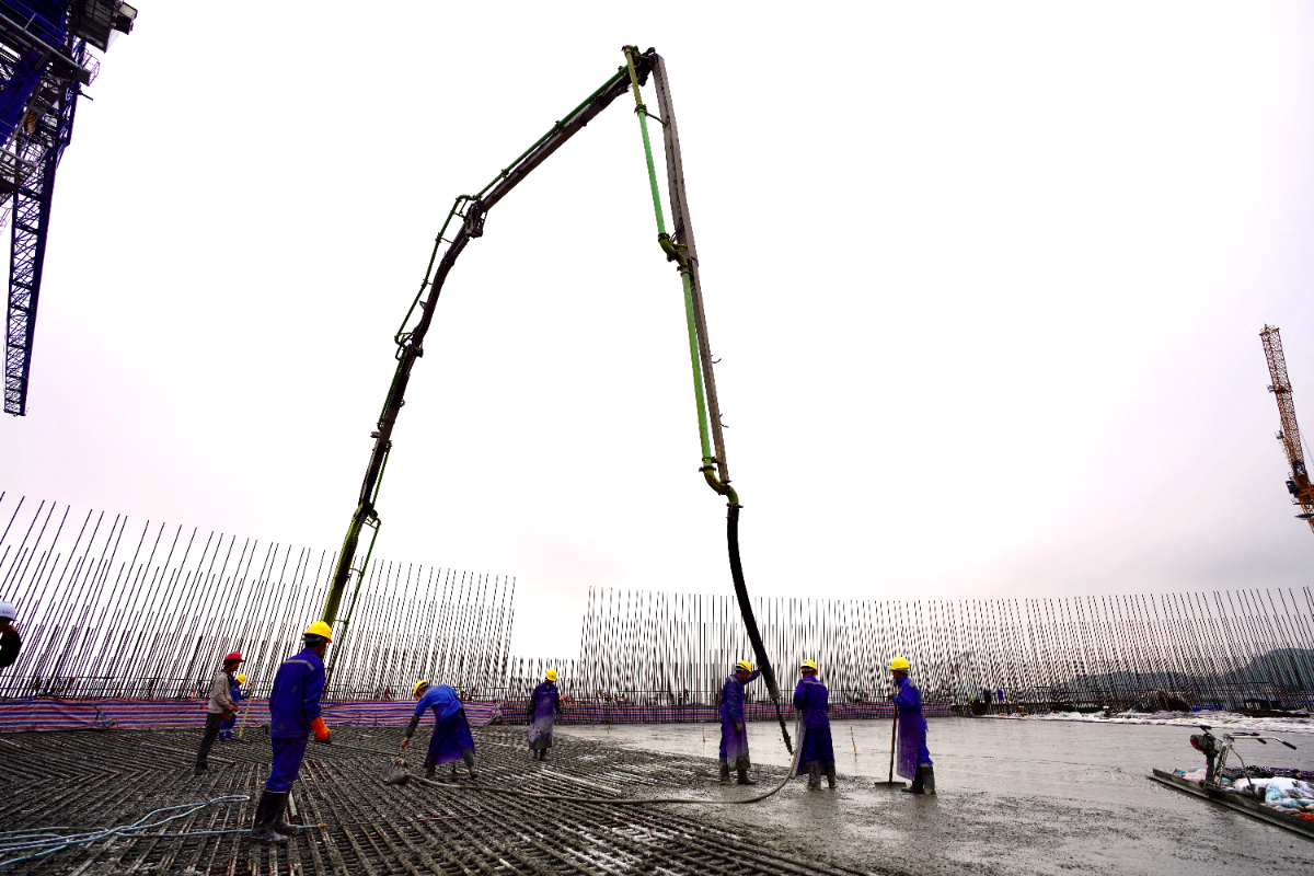 找彩吧六横LNG接收站1号储罐承台正在进行混凝土浇筑。 周志南 摄