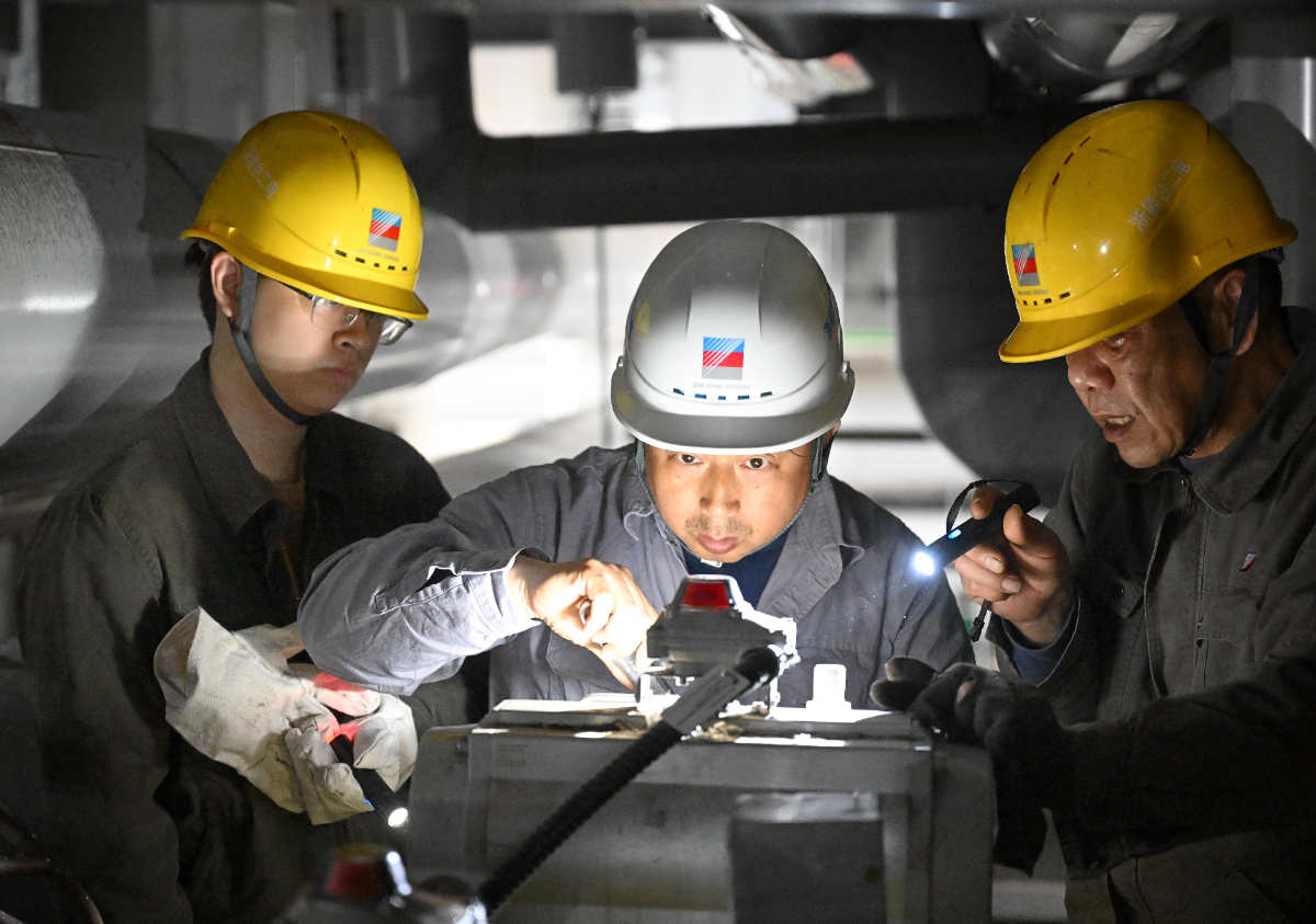 找彩吧台二电运行部人员在检查1号机3号高加危急疏水调节阀。 李泽 摄